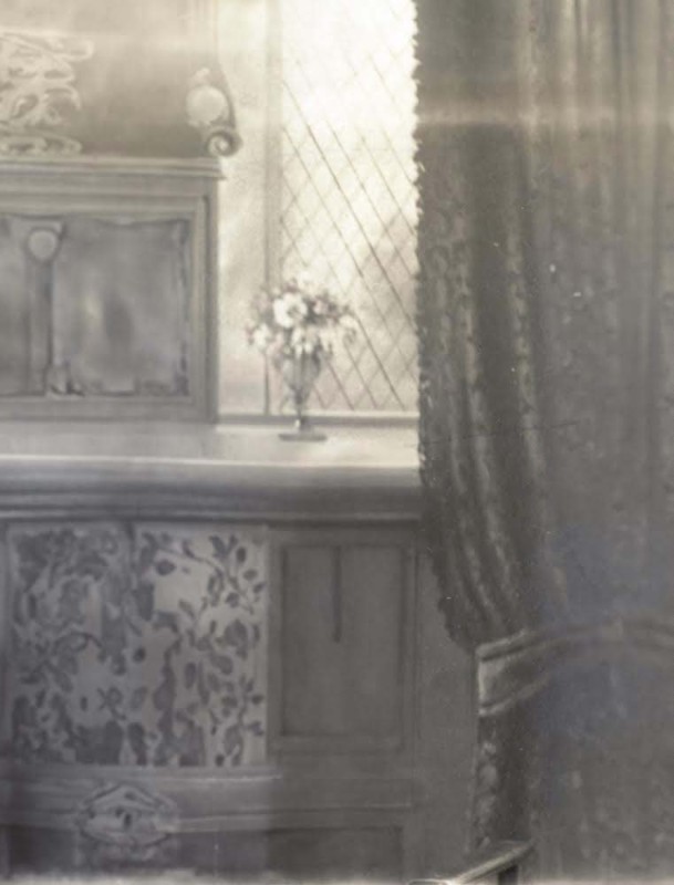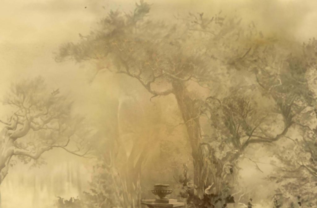 Quite a while ago I was looking at the backdrops used in studio portraits of World War I soldiers (see ‘Backdrops‘, . ‘ WWI Backdrops‘, ‘Backdrops (Odilon Redon)‘, ‘The Past in Pastoral‘) and so I thought that I could use these backdrops as a background for a scroll. The image below is something I did several years ago where I isolated the backdrop in the postcard.