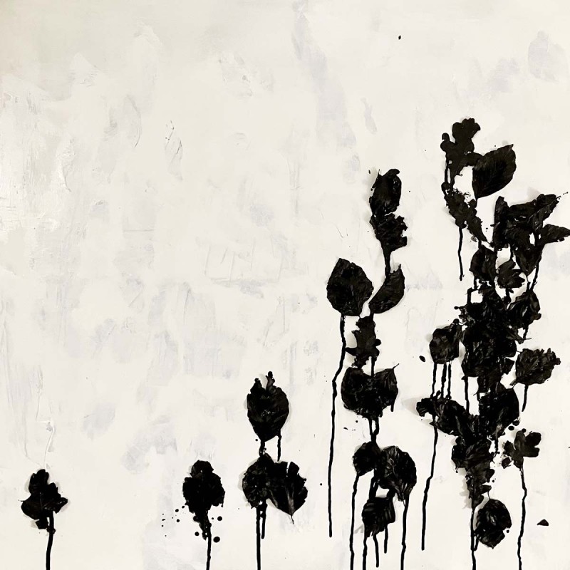 I’ve started a new painting on an 80cm square canvas which takes the concept of shadows cast by trees in the woods by using actual leaves. These are first dipped in black ink to simulate the black ink brushstrokes of my other paintings – for example those I painted in situ at Shotover, then placed on the canvas painted with white oil paint.