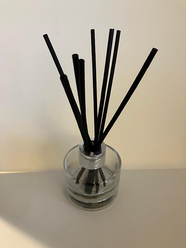 The glass container is approximately 3 inches in height and inside is a liquid; not much – just a few millimetres. The bottom of the sticks rest on the bottom of the container and in the liquid which coats the bottom of the sticks. There is some writing on the glass container which includes a description of the obvious scent coming from the container.