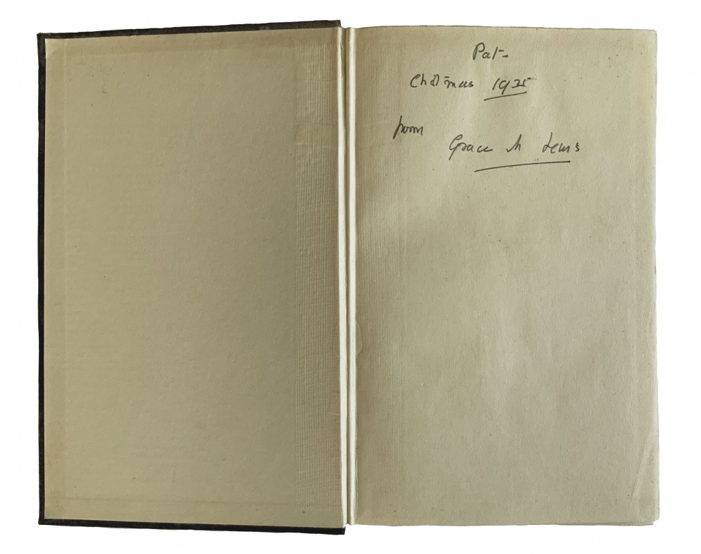 Grace wrote the words with a fountain pen, blew on the words and then, having left it to dry, closed it again, smoothing the cover which I have just done. Is it wrapped? Is it unwrapped? Was it given in person? Was Grace there when Pat opened it?