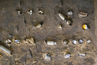 I was reminded of a photograph I took recently of the holes left by railings removed during World War II…