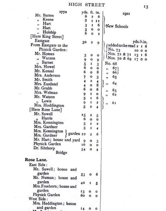 The page reproduced below, is taken from the survey and represents the bottom end of the High Street where it meets Magdalen Bridge – the Bridge can be seen listed below the name of a Dr. Sibthorpe. The Physick Garden above, is the old name for what is now the Botanic Gardens.
