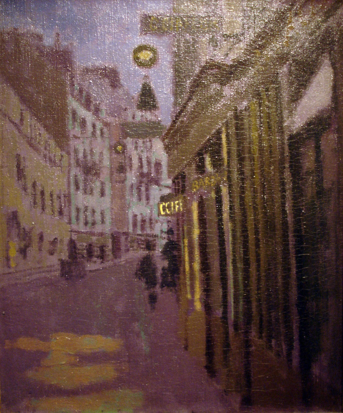 So what do we see in this work? Well, it’s a road in Paris (the rue Notre-Dame des Champs), one on which the painter John Singer Sargent had a studio. Given the muted palette and bruised sky, the picture shows a scene from about that time of day when the night begins removing all the colours from the world, when the last light in the sky, makes all manner of colours that seem to last for just a few seconds. It’s a wet end to a day that’s more than likely seen nothing but rain. The concertinaed facades of the shops with their heavy paint dragged down the surface, the downward strokes of the windows in the buildings opposite and the vague forms from which the scene’s almost entirely comprised, all suggest the fading light and drenched air of an autumn or winter evening.