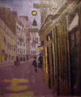 Returning for the moment to the glare of the lights, I found that when I looked at the painting from the right hand side, the glare subsided, and that all that remained were just a few specs where the paint was raised above the rest of the surface. Furthermore, from this position, the painting seemed to open up, as if the concertinaed lines of the shop facades were being pulled, expanding like bellows. Here, the street seemed to pull me on. Standing directly in front, it almost seems about to collapse upon itself.