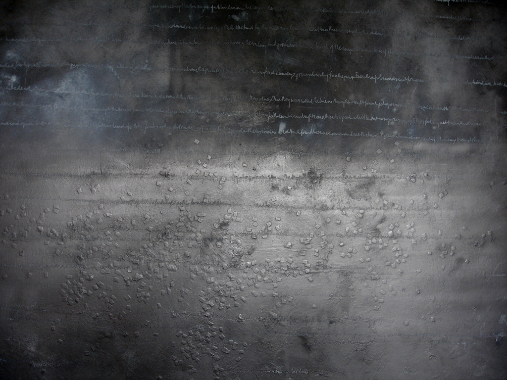 The light in the room was kept low. On the first wall (on the left as you walked into the room) I’d attached the transcription of the words spoken while making the book of drawings and the subsequent pages of processed text.
