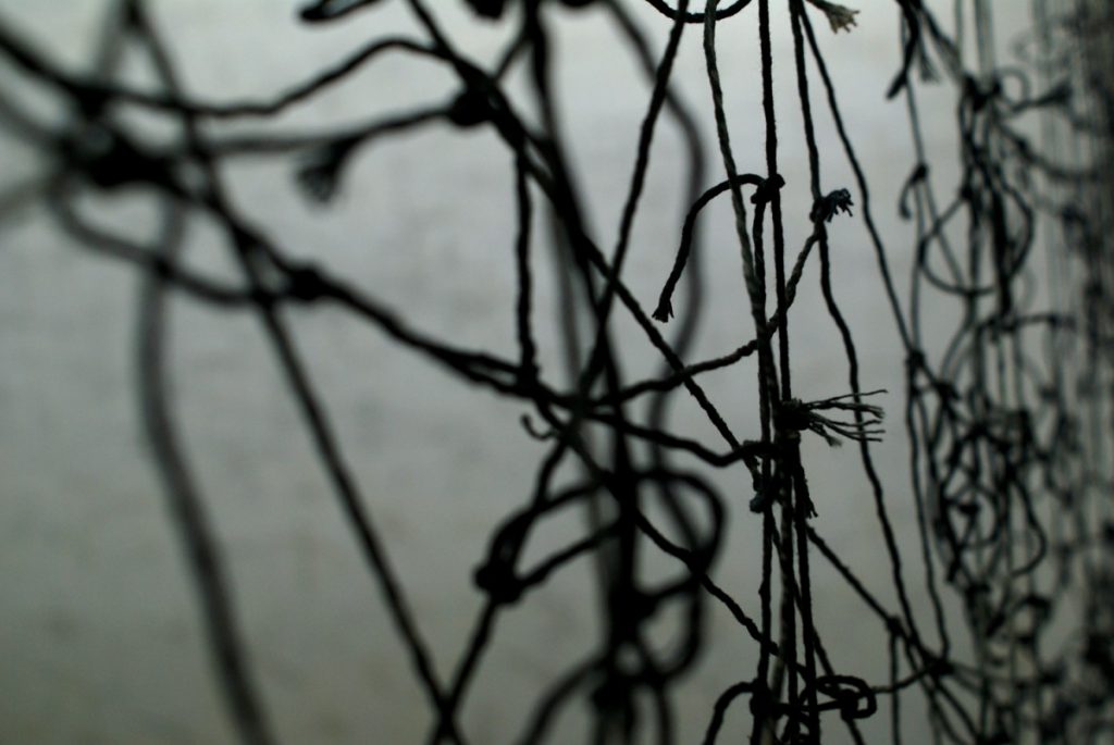 “The drawings could be said to represent a last, snatched glance at the gate-tower of Auschwitz-Birkenau and their number a testament to the number of people who died there. It could also be said to illustrate my own, almost obsessive incomprehension at having stood in a place where over a million people died. Death is described by the pieces of string – the thread of life drawn, measured and cut; each one tied to make the Dreamcatcher. Dreamcatchers themselves are said to let the good dreams through whilst snaring the nightmares, and for all the victims, Auschwitz-Birkenau was exactly that – an nightmare place which they could never leave. I on the other hand could do just that. I can never know what it was like to be there, just as they could never know what it was like to leave.”