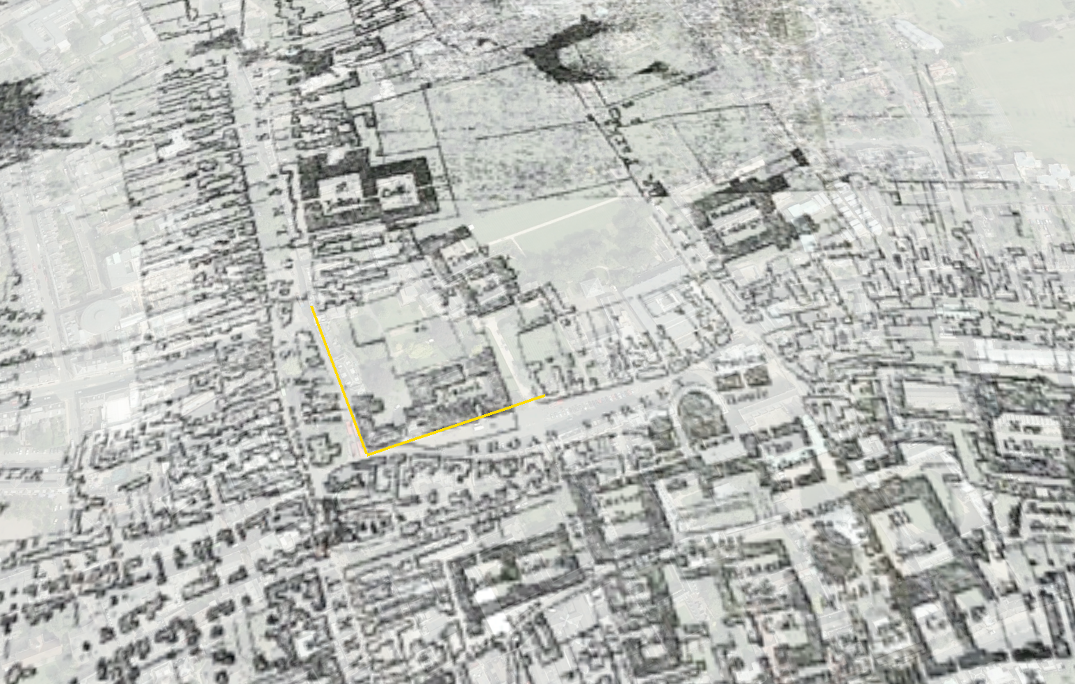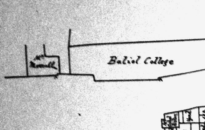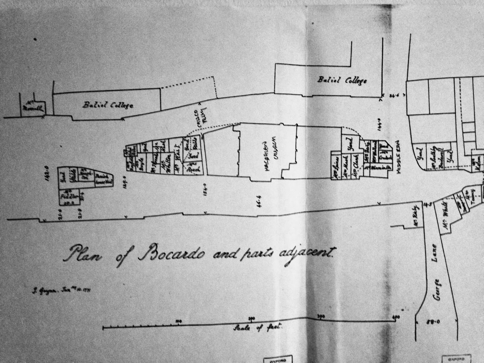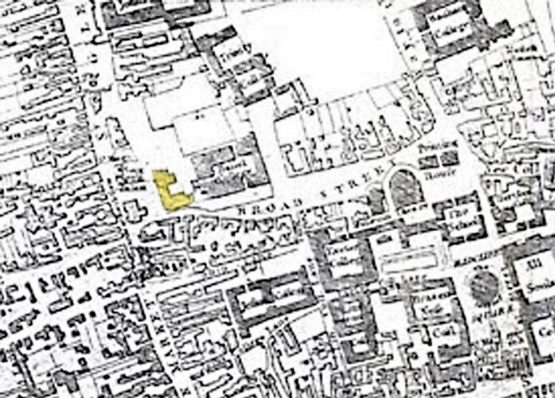 I need to get a copy of H.E. Salter’s Survey of Oxford in 1772 with Maps and Plans to work out where exactly this is (the above extract is from Google books). However, it might be that as we have [Here Broad St.] and given that the length of Balliol College is given as 140 yards (128 metres), that Mr. Borton’s property is on the north side Broad Street. But then Balliol College, west end would seem to be that part of the college shown in yellow below. In which case Mr. Borton’s property would actually be nearer St. Giles.