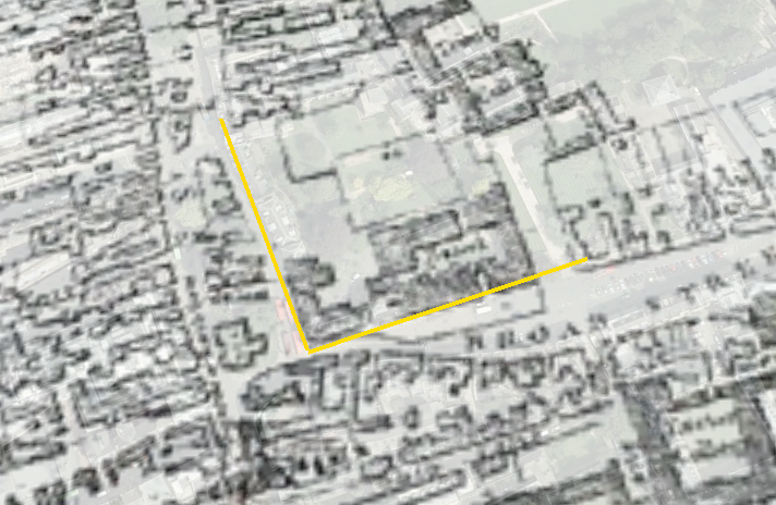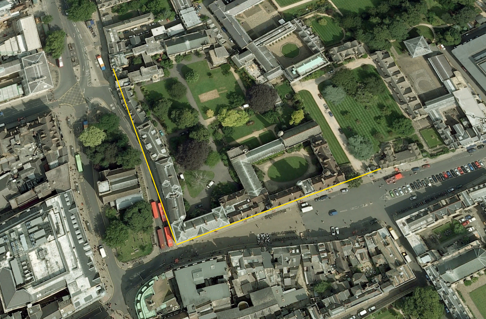 The name in the ‘box’ next to Balliol College is Mr. Morrell, which when we look at the list at the top of the page is the first name after Balliol College. His property would have stood approximately where the orange-brown neo-classical building stands now. Four yards to the left would have been Mr Fidler’s property and occupying the land next to that would have been my ancestor’s property, which I believe was an inn.