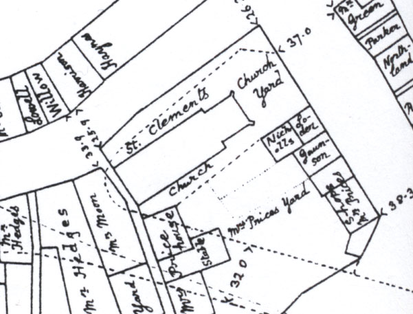 It shows the route we know the stranger took – the narrative line of this story – on December 12th 1770 along with the names of those who lived or owned properties bordering the street in 1771/72. Interestingly, my namesake – at least as far as my surname goes – owned property just in front of the old church of St. Clement which was demolished in 1828.