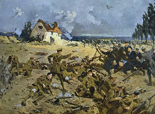 The following is a painting by Fred Roe (1864-1947) entitled The Eighth May which shows a scene from the Battle of Frezenberg Ridge, which took place on 8th May 1915 in what was to become known as the Second Battle of Ypres. My great-great-uncle, Jonah Rogers was killed that day near the farm depicted in the painting.