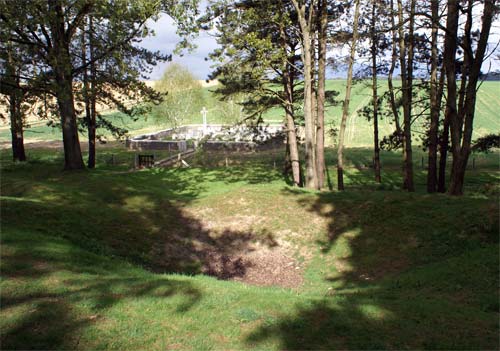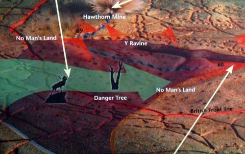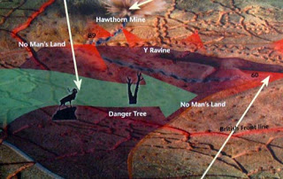 The following images show the Caribou Monument to the Newfoundland Regiment (shown on the map above) which stood at the British Front Line. The Danger Tree is that shown above which marked the furthest many men managed to get. The Y-Ravine is behind the German Front Line, the trenches of which are also shown below.