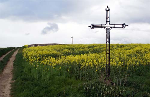 It’s one of the few sites in the Somme region where the ground has remained largely untouched since the end of the First World War. The trenches are still visible, for example, St. John’s Road and Uxbridge Road which once led to Hyde Park Corner and Constitution Hill; trenches now filled in beneath a field of Rape (the line of the Uxbridge Road trench has been marked in white in the car park).